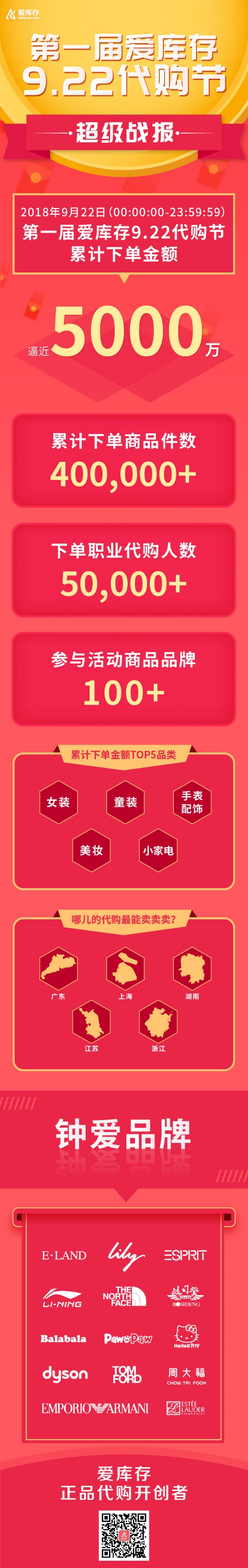 截至2018年9月22日24时,爱库存主办的9·22首届代购节日销量逼近5000万,5万余名职业代购日下单商品超40万件。共计百余国内外知名品牌参与了本届代购节,最受欢迎的商品品类是女装、童装、手表配饰、美妆和小家电,最受代购和消费者钟爱的品牌有Eland、Lily、Esprit、李宁、The North Face、波司登、巴拉巴拉、paw in paw、Hello Kitty、阿玛尼、戴森、汤姆福特、雅诗兰黛、周大福等。