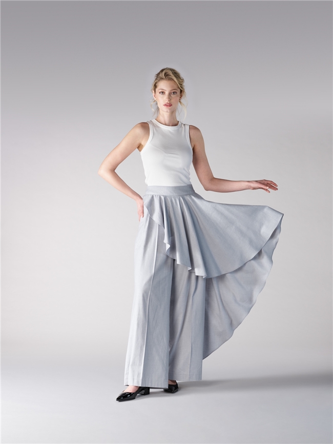采用瑞士Alumo的Cashmerello Light面料——85%棉与15%羊绒的混纺,轻盈可穿越四季。裙片式垂坠褶裥,行走时如湖面涟漪层层荡开。高腰设计勾勒腰线,隐藏式RiRi拉链让线条干净利落。一条可以陪伴女性从办公室走进晚餐的长裤。
