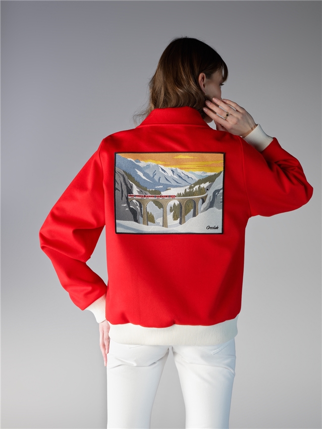 英国Hainsworth Doeskin美利奴羊毛,触感如麂皮般柔软。后背刺绣呈现圣哥达全景快车的壮丽风景——雪山、森林、蜿蜒的轨道,由Beca Ferretti以数十万针手工完成。金色RiRi拉链在红色面料上划出一道温暖的光痕。